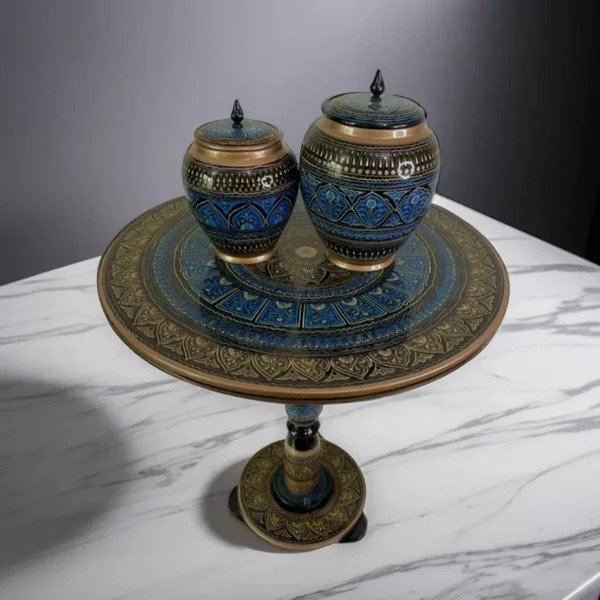Handcrafted Naqshi Art Accent Table – Decorative Wooden Side Table with two candy jars